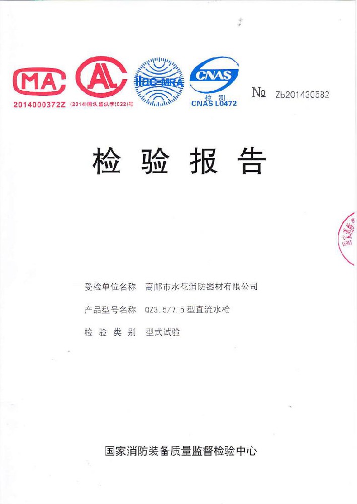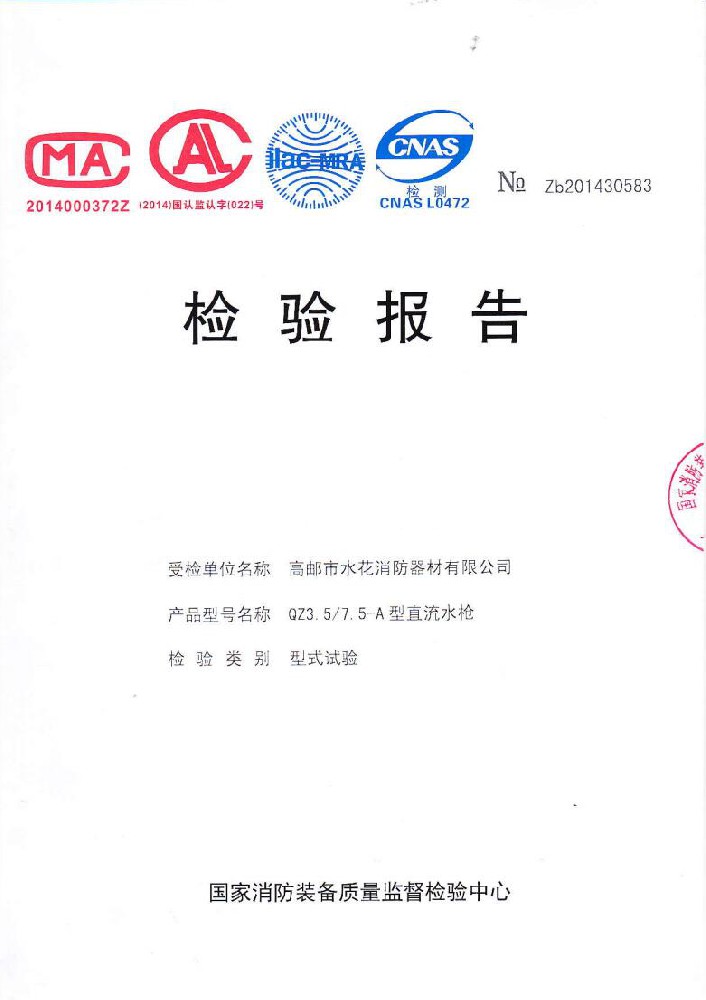 I plant was founded in June 1976, the existing staff of 600 people,including all kinds of technical and management staff of 68 people.With 50 millon yuan in fixed assets,covers an area of over 35,000 square meters,construction area of over 25,000 square meters.The establishment of a sound quality system. made a variety of "measurement of qualified certification",and become Jiangsu and more provinces of the fire association member units.Factory strong technical force,production and testing equipment,advanced technology.Production "water flower"brand water with intertace:KDK65,KD65,KY65,KN65.Fire water gun:QZG3.5/7.5,QZ3.5/7.5,QP8/0.7Z foam water gun.Indoor fire hydrant:SN65,SNW65-1,SNZ65,SNZW65-1.Fire hose reel JPS0.8-19/25.Production of "postal" card,fire with lining water:65-8,10,13.16,20,25 type;80-16,20,25 type.Water interface:KD50,65;KY50,65;KN65.Fire water gun:QZ3.5/7.5.5.Indoor fire hydrant:SN65,SNW65-1,SNZ65,SNZW65-I.And in May 2015 through the Ministry of Public Security Fire Product Conformity Assessment Center 3C version of the inspection access to all of the above products,mandatory certification,to allow the production and marketing,product marketing throughout the country,praised by the majority of users.